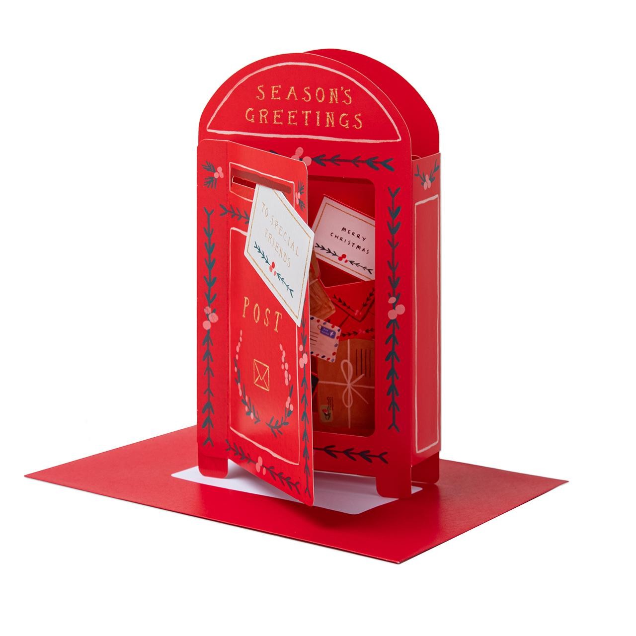 Share a heartfelt Christmas message with this unique M&S Special Friends 3D Christmas card. This card pops up to resemble a traditional postbox, offering an engaging and memorable way to send festive greetings.