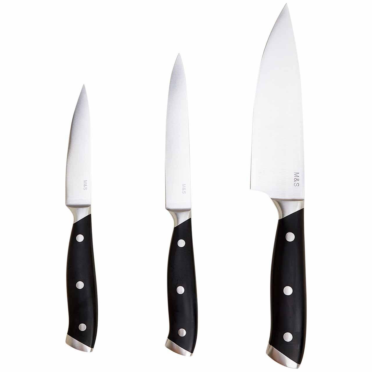 This essential Marks & Spencer set features three versatile stainless steel knives designed for comprehensive daily food preparation. The tools combine polished, durable blades with traditional black handles, securely fastened using three visible silver rivets. This robust construction method ensures reliable performance and a comfortable grip for various culinary requirements.
