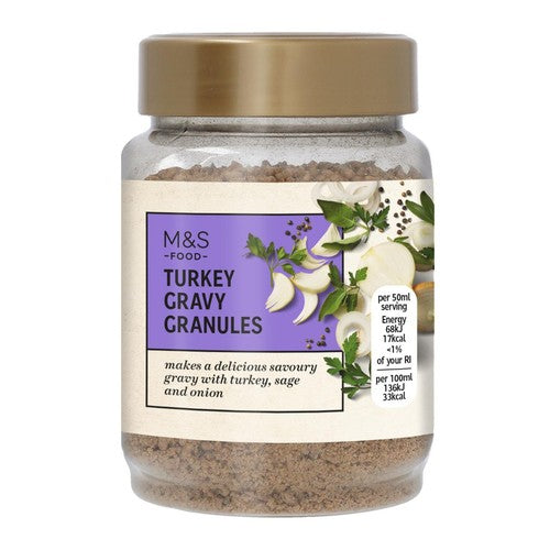 These M&S Food Turkey Gravy Granules provide a quick and simple solution for adding rich flavour to roasts and accompanying dishes. Made to create a savoury gravy, this preparation is infused with classic notes of turkey, sage, and onion for authentic taste. The product is presented in a convenient glass jar for easy storage and use in the kitchen.