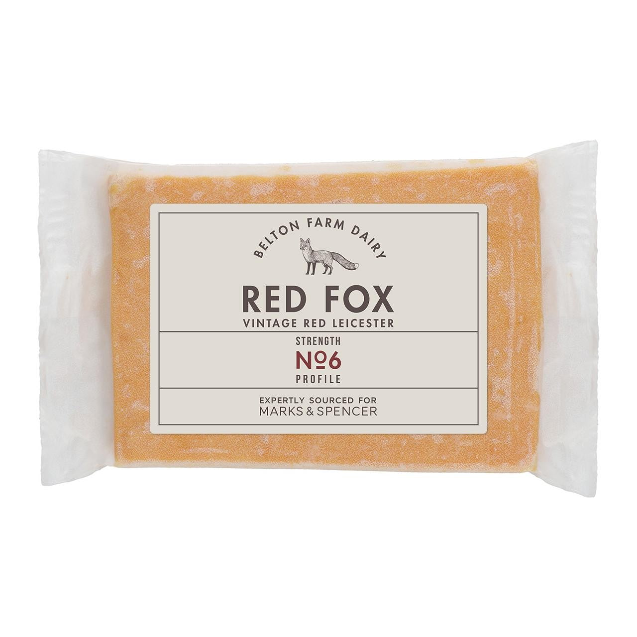 This Belton Farm Dairy Red Fox is a Vintage Red Leicester cheese, expertly sourced for Marks & Spencer. It features a distinct N°6 strength profile, indicating a robust and mature flavour for cheese lovers. This premium selection offers a rich taste derived from careful aging processes.
