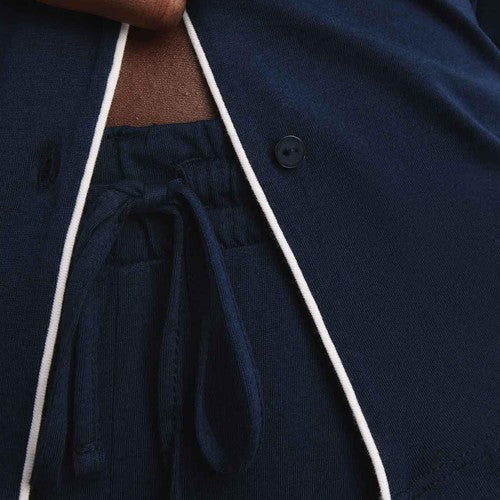 • The button-through top features a relaxed revere collar and contrasting piped trims.