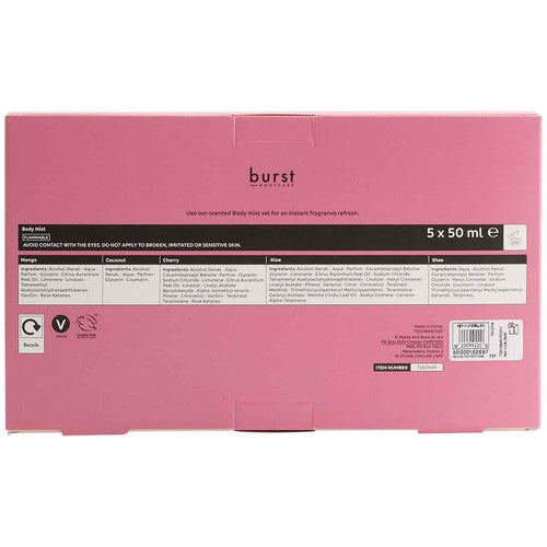 This M&S Burst Bodycare collection offers five distinct mini body mists for versatile fragrance layering. It is presented as an ideal gift or a personal treat for light scent application throughout the day.
