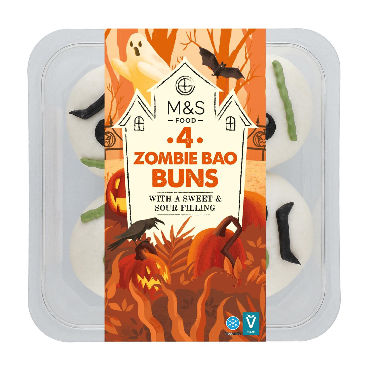 These M&S Zombie Bao Buns offer a unique and amusing addition to your snack selection for any occasion. This pack includes four soft, steamed wheatflour bao buns ready for quick consumption. They are filled with a richly flavoured, sticky sweet and sour mixture, providing a distinct savoury taste experience.