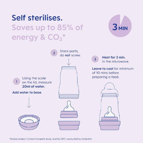Made with MAM's signature SkinSoftTM teat for that familiar feeling. A vented base lets air escape and not end up in the baby's mouth. Self-sterilises in the microwave in just 3 minutes. Allows you and baby to enjoy special moments of bonding. Great for combination feeding or moving baby from breast to bottle.