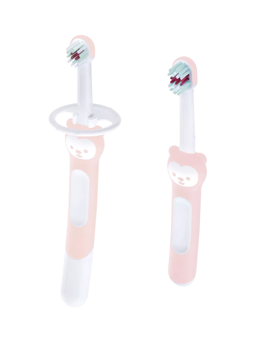 The MAM Learn to Brush features two brushes, one extra-long handled toothbrush for babies and parents to hold together and a shorter handled brush for infants who no longer need to be guided. Both brushes feature compact, ergonomic handles that are easy to hold for baby. The larger long handle means that parents can carefully brush together with their children, ensuring that all teeth are properly cleaned and helping baby to learn the correct brushing technique. The longer brush also features a removable safety shield to keep the brush away from the back of your little one's mouth, removing the risk of choking. When children are old enough to try brushing their teeth independently, the smaller brush’s size makes it easy and comfortable for small hands to hold. The carefully shaped brush head ensures thorough cleaning and has a toothpaste indicator to guide you on the right amount of toothpaste to use.