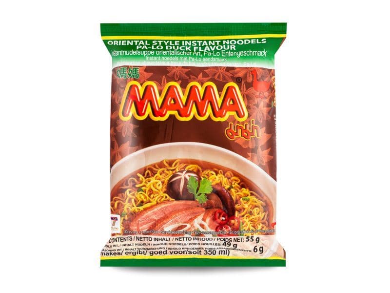 Mama is Thailand's leading producer of instant noodles. Mama\u2019s Pa-Lo Duck Flavour Noodles are instant noodles with the flavour of rich, fatty duck meat. Pa-Lo Duck is derived from a Chinese recipe that combines the distinctive taste of duck fat with a sweet medley of Chinese spices, most notably cinnamon and star anise. Mama's noodles are soaked in a soupy broth filled with savoury duck flavour, cinnamon, anise, and soy sauce. A delicious instant noodle creation that is quick and easy to prepare. Simply add boiling water, wait a few minutes, and enjoy.