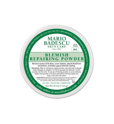 Mario Badescu Blemish Remedy Powder offers targeted care for imperfections overnight using a unique drying formulation. This finely milled powder is specifically designed to address active blemishes efficiently while you rest. It assists in drying out spots effectively, helping to reduce their visibility and associated discomfort by morning.