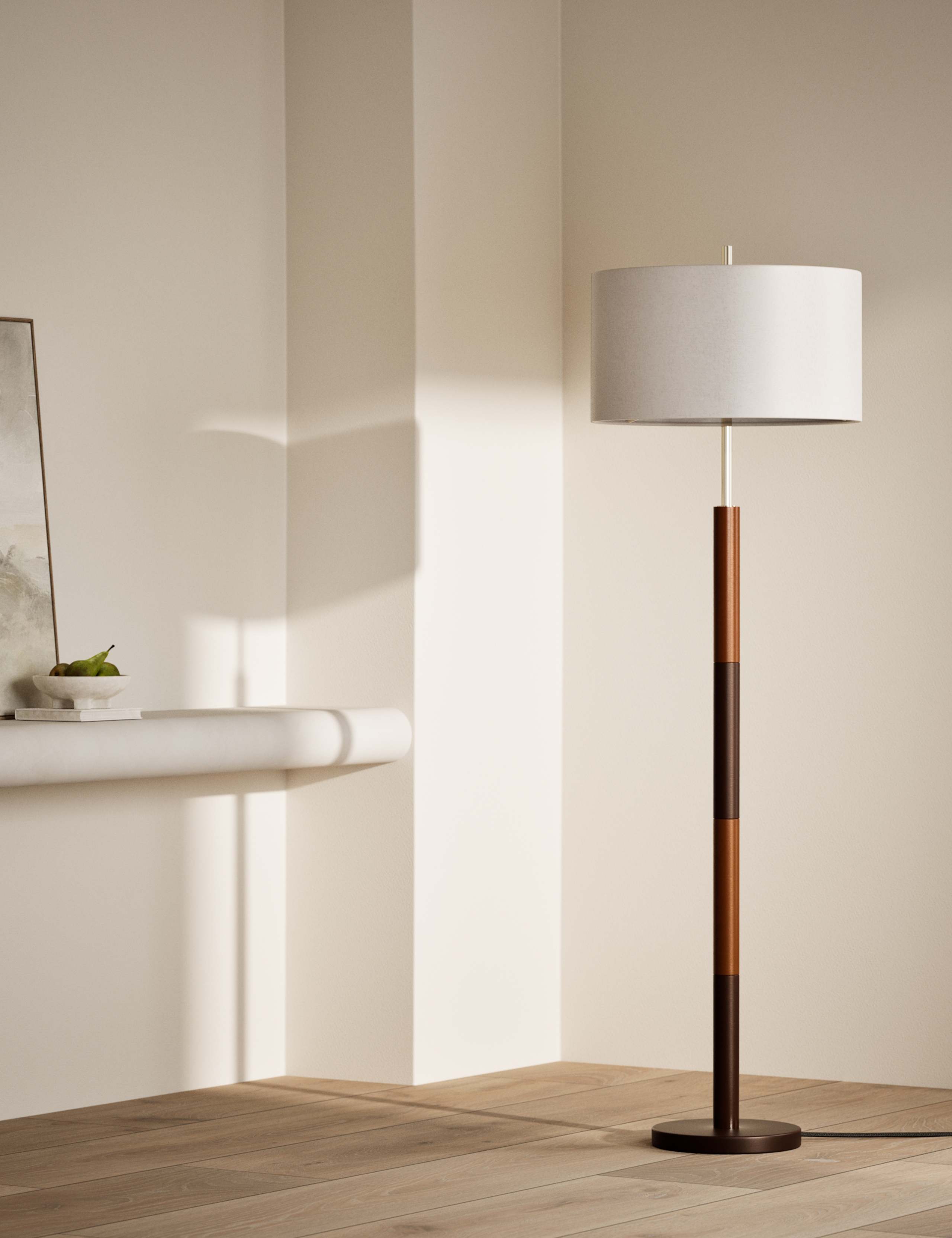 This Marlowe Floor Lamp elevates any living space with its distinctly minimalist aesthetic. It features a refined silhouette combining natural materials with sophisticated metal detailing. The lamp is designed to provide ample, soft illumination through its large shade.
