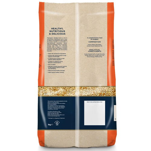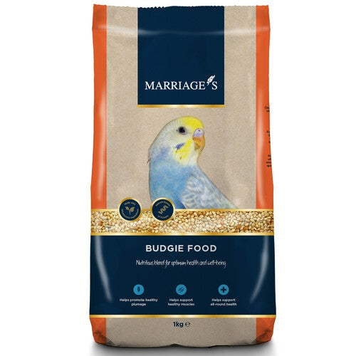 Read MoreDescription Covering all life stages, our comprehensive range of seed mixes help to assist budgies all-round health. Whether they’re breeding, moulting, or being displayed for show, our appetising feeds have been specifically formulated to help support their dietary needs. By providing a balance of carbohydrates, proteins and fats, we’ve ensured that budgies get the nutrients they need to maintain healthy muscles, plumage and skin. Features & Benefits • Made with wholesome ingredients • Packed with natural protein to help support overall health • A natural source of fibre to help support optimal digestion • Contains no artificial colours, flavours or preservatives • Easy to digest • Naturally includes essential nutrients to help support optimum health and well-being • Helps promote healthy plumage • Helps support healthy muscles Marriage’s - Nourishing those you cherish