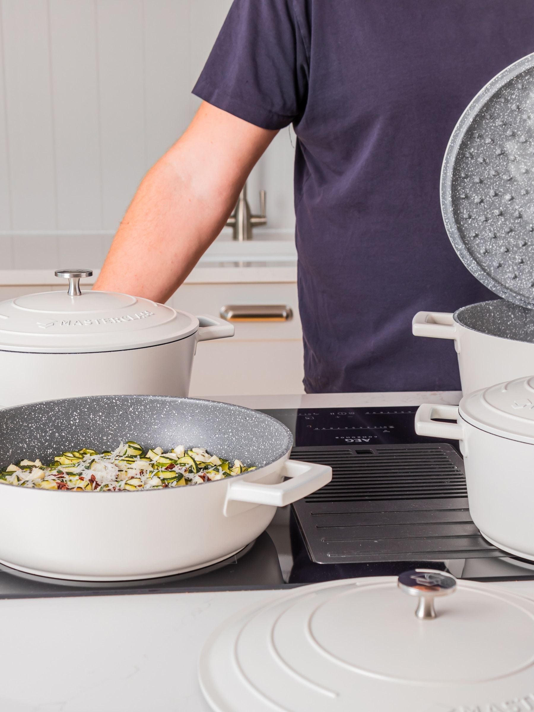 A revolutionary alternative to those bulky pots, the Cast Aluminium range from MasterClass proves that you can benefit from a solid casserole dish with outstanding performance that is surprisingly lightweight and easy to handle. In fact, it has all the benefits of cast iron, without the hefty weight or price tag. Designed with durability in mind, the pot is made from high-grade aluminium and is reinforced by a double scratch-proof layer that acts as a non-stick too. Because aluminium is an excellent heat conductor that cooks food quickly and evenly, you can easily prepare all those comfort foods that we all enjoy eating at home. Cook hearty beef stews, spicy curries or Moroccan tagines on the hob, including induction, or put it in your oven if you need to. The large casserole dish features an ergonomic knob and two handles to make it easier to move the pot from stovetop to oven and includes a self-basting lid to retain all those flavourful liquids and juices. Right after serving and enjoying your meal, cleaning won’t be a hassle, as you can simply rinse it with warm water or pop it in the dishwasher for good-as-new results. Originally just black, now you can choose any colour within the rainbow, so you can suit your kitchen or your mood. From the soft floral shades of lavender and mint green to bolder colours such as metallic blue, hunter green and grey ombre there is plenty to choose from. Still nothing for you? Joining the ranks are also red, cream and blue sky colours. Select from 2.5L (4.5 pints, 85 fl oz), 4L (7 pints, 135 fl oz) or 5L (8.5 pints, 169 fl oz) pots and build your own cookware set. This casserole dish is made to last, so MasterClass is extremely confident in offering a Lifetime Guarantee with Five Year Non-Stick Guarantee. Buy once, buy smartly!