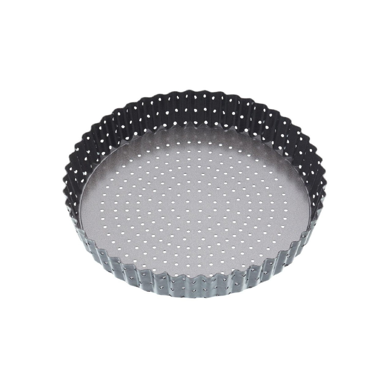 This MasterClass Crusty Bake 20 cm (8â) Non-Stick Loose Base Fluted Tart Tin / Quiche Pan makes it a doddle to bake the perfect quiche or flan every time â with a crispier crust, an evenly baked filling and no more soggy bottoms! This flan tin is made from heavy duty materials, and features a clever perforated design. These tiny holes enable the moisture from your pastry to escape, and the heat from your oven to circulate more evenly through the pastry and filling. With this and its fluted edges, youâre left with a gorgeously crisp and crumblier bake.- ACHIEVE GOURMET CRISPINESS: this flan tin's tiny holes circulate hot air for golden, crispy results- PERFECT FOR PASTRY: use this baking tin to make crisp, crumbly quiches, flans and tarts- QUANTUM II NON-STICK: it releases bakes easily, thanks to this innovative, BPA-free double non-stick coating- RECOGNISED QUALITY: this quiche/flan tin is part of MasterClass's multi-award-winning Crusty Bake collection- GUARANTEED: it's protected by MasterClass's 20 year guarantee and five year non-stick guarantee