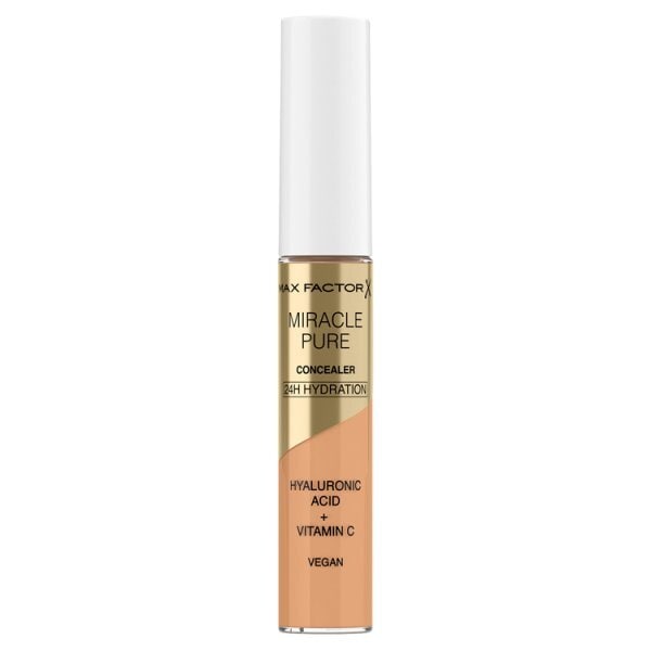 believe in miracles inspired by skincare mastered by max factor new miracle pure concealer is clinically proven to care for skin while you wear it the lightweight formula contains hyaluronic acid vitamin c and peptides it gives medium natural coverage and works perfectly on the face and under the eyes providing creaseless all day gentle coverage illuminating brightening and giving 24hydration clinically and dermatologically tested suitable for sensitive skin with a super soft flexible and precise applicator available in 8 shades and designed to work in harmony with max factors miracle pure foundation