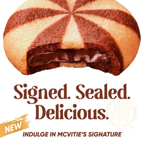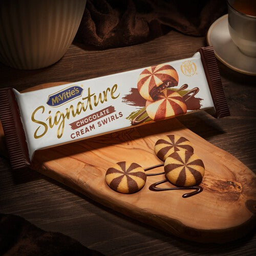 Enjoy the classic taste of McVities Signature Swirls, expertly combining satisfying textures in every bite. These treats feature a crunchy cocoa and vanilla biscuit base perfectly complemented by a smooth chocolate cream filling at the centre. They offer a delightful moment for afternoon tea or a simple, familiar indulgence.