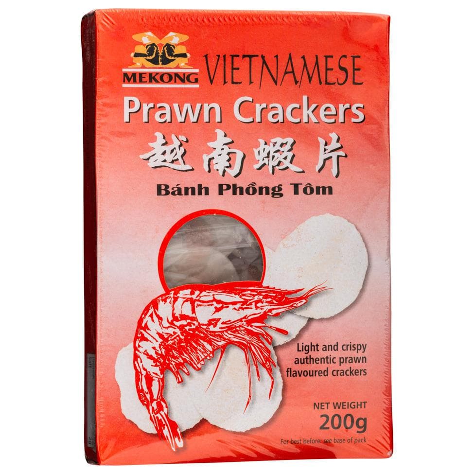 Mekong Vietnamese Prawn Crackers are a popular and tasty snack originating from Vietnam, known for their light, airy texture and savoury seafood flavour. Made primarily from ground prawns, tapioca flour, and seasonings, these crackers are traditionally sun-dried and then deep-fried to achieve their signature crispy texture. \n\n