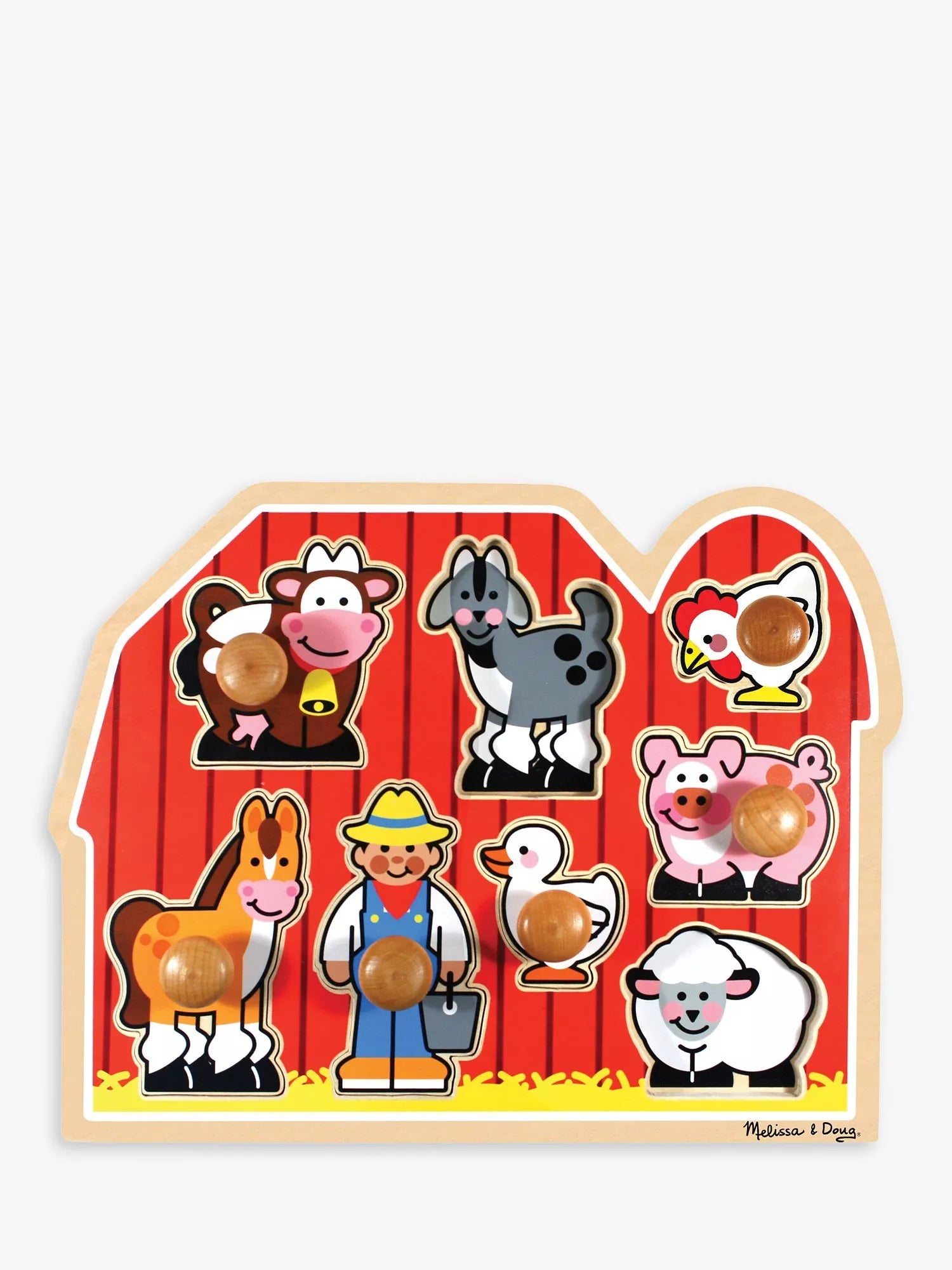 Seven favourite farm animals and a farmer stand out against the big red barn on the Farm Friends Peg Puzzle from Melissa & Doug. The extra-thick wooden puzzle includes eight pieces, with easy-grasp pegs. Full-colour, matching pictures appear underneath each piece, to encourage eye-hand, fine motor and visual perception skills.