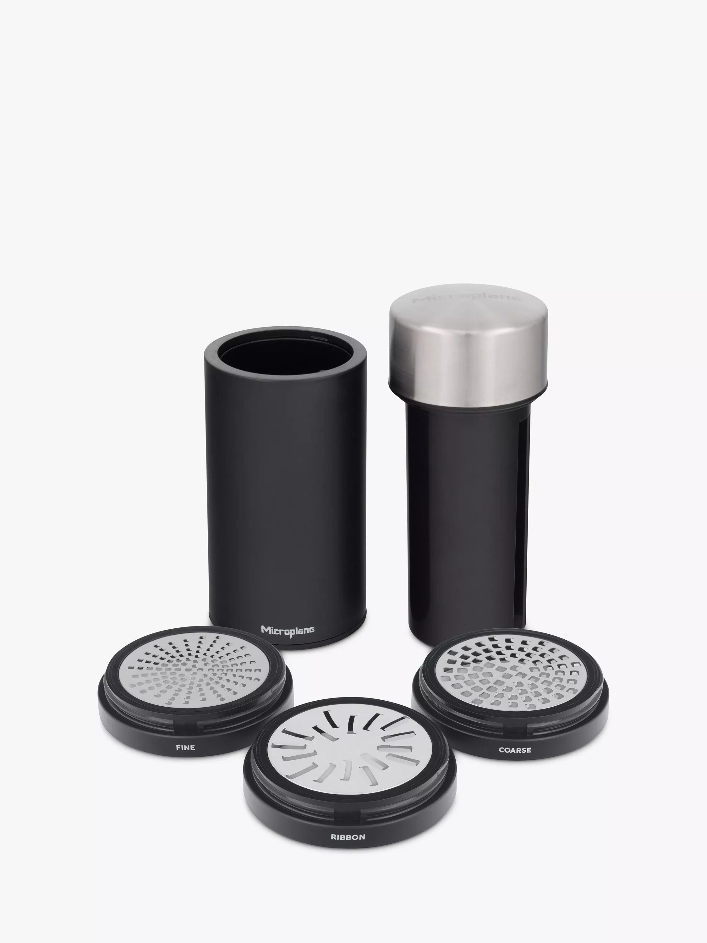 A compact and stylish design, this Microplane Universal Mill has three different interchangeable blades: fine, coarse and ribbon to grate food directly during cooking or at the table.