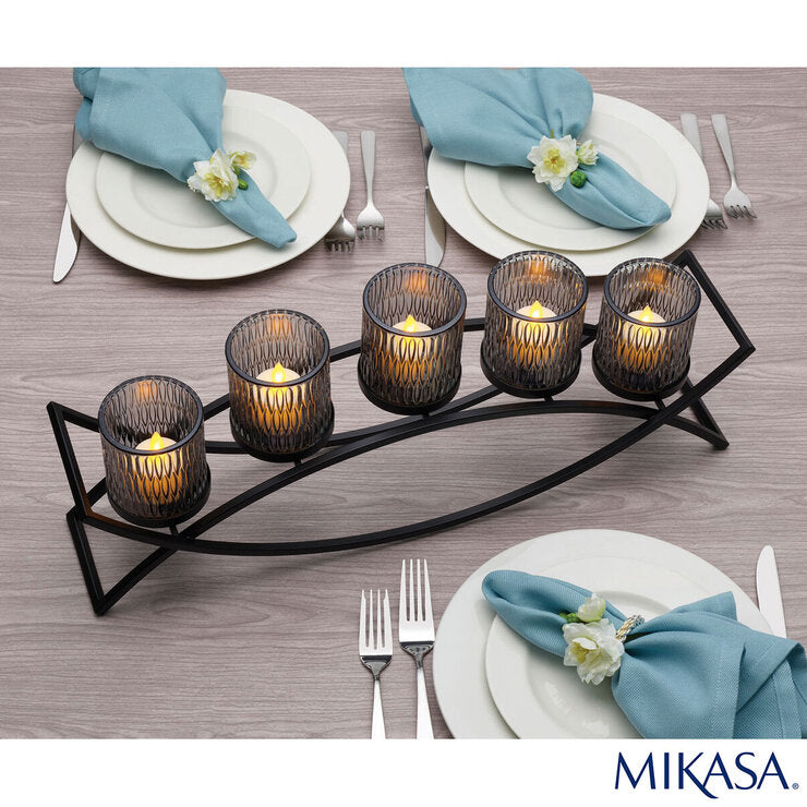 - Holds 5 glass votive cups within its frame to create a bridge of light