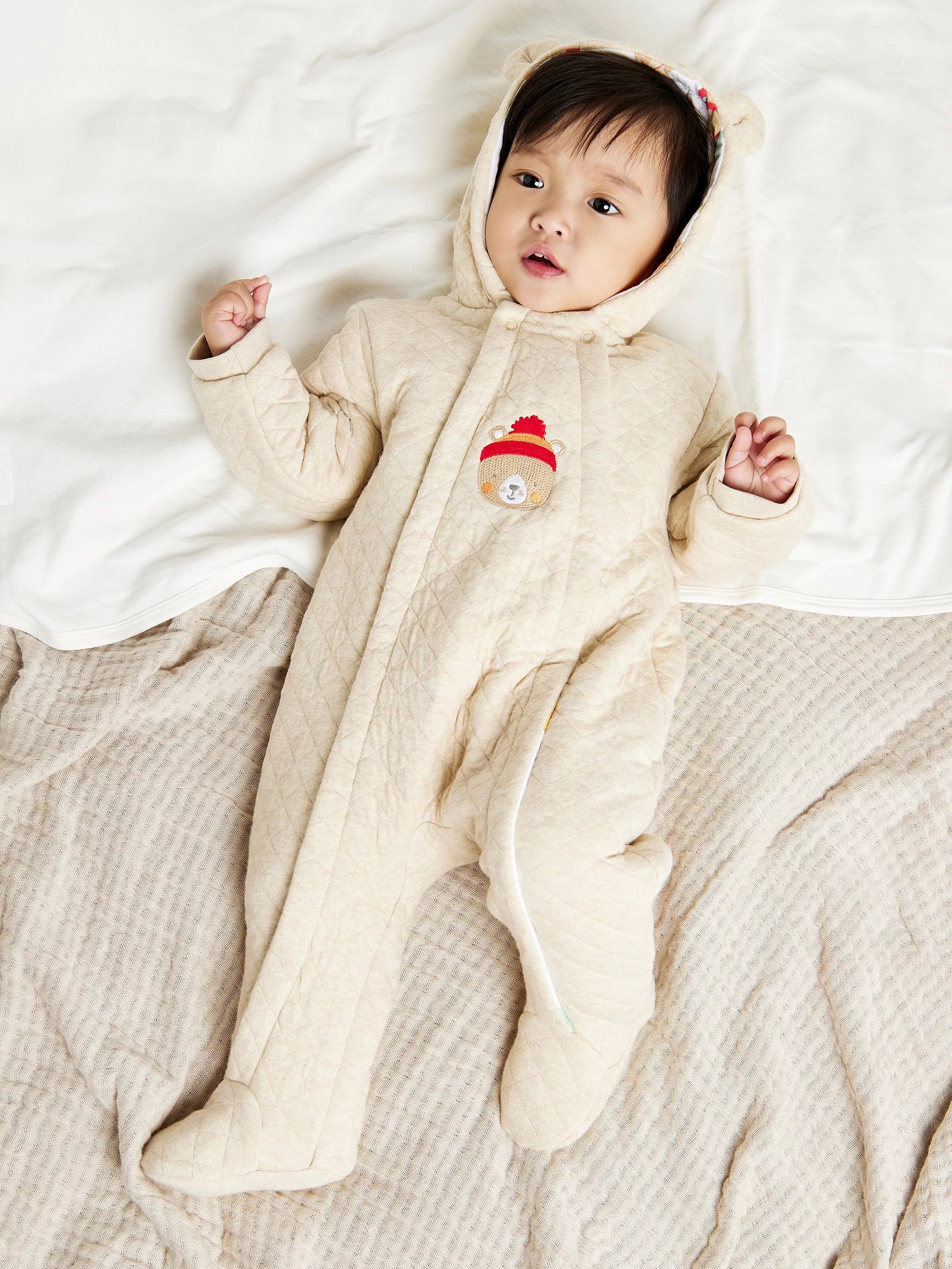 Wrap your baby in warmth with this quilted pramsuit - with bear ears on the hood for extra cuteness. Finished with an embroidery design on the front and a double zip opening for easy dressing. Rib cuffs ensure a snug fit and the cosy lining provides extra comfort.