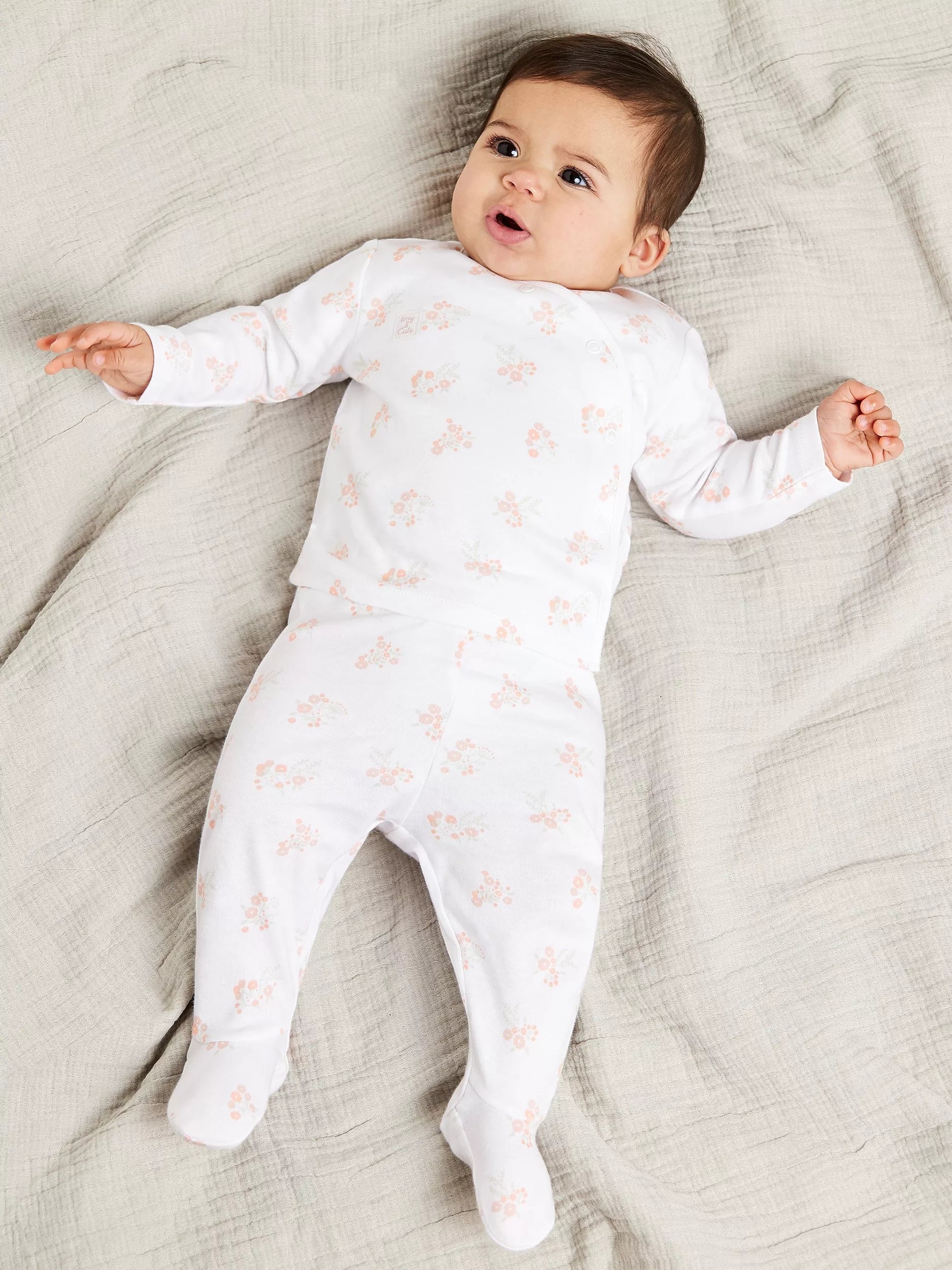 Including a front-open top, sleepsuit, footed jogger, cap and mittens, the soft palette and sweet print finish the set with adorable appeal. The high-quality snap buttons make for easy dressing and additional grown on scratch mittens keep baby comfy.