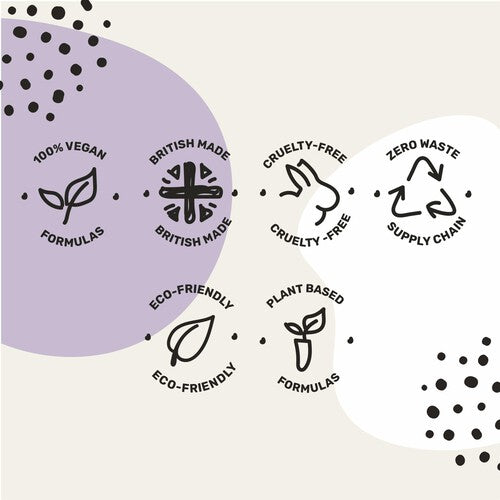 Free From: SLS/ SLES (Sulphates), Parabens, Phosphates, Phosphonates, Chlorine Bleaches, Sulphites, Isothiazolinones, Gluten, Microplastics, Artificial Preservatives and Colours, Triclosan, Petrochemicals, GMO's, E.D.T.A, Formaldehyde, Titanium Dioxide, Optical Brighteners, Lanoline, VOC's.