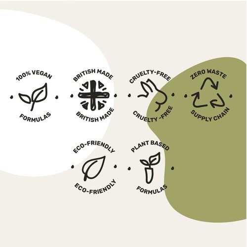 Free From: SLS/ SLES (Sulphates), Parabens, Phosphates, Phosphonates, Chlorine Bleaches, Sulphites, Isothiazolinones, Gluten, Microplastics, Artificial Preservatives and Colours, Triclosan, Petrochemicals, GMO's, E.D.T.A, Formaldehyde, Titanium Dioxide, Optical Brighteners, Lanoline, VOC's.