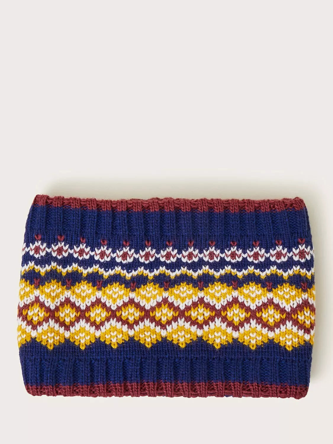 For keeping their ears, nose, and necks super toasty. Stitched with a fair isle pattern in warm, autumnal hues, this knitted snood keeps them snuggly all season long.