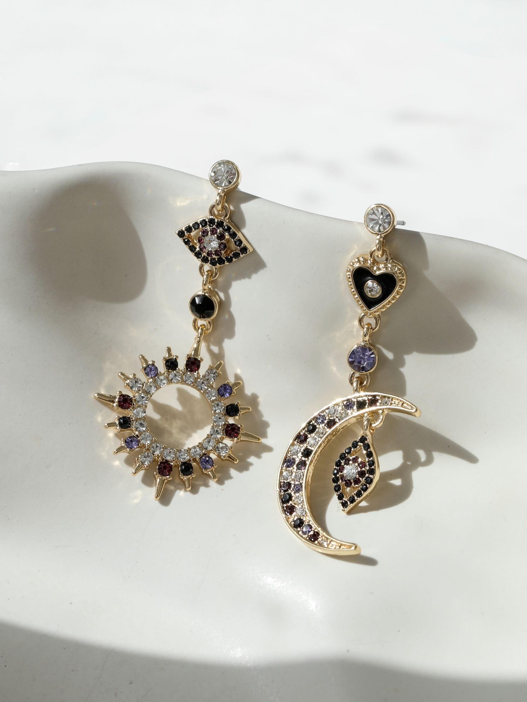 Our Mood Mismatch Celestial Earrings bring a magic-inspired look to your everyday style. With multicoloured crystals and celestial detailing, these gold earrings are the perfect blend of elegance and character. A bold accessory designed to add glam to any outfit. Fastening: Post and Bullet Back. Width dimension: 23mm. Length dimension: 67mm. Material: Gold Plated Base Metal.
