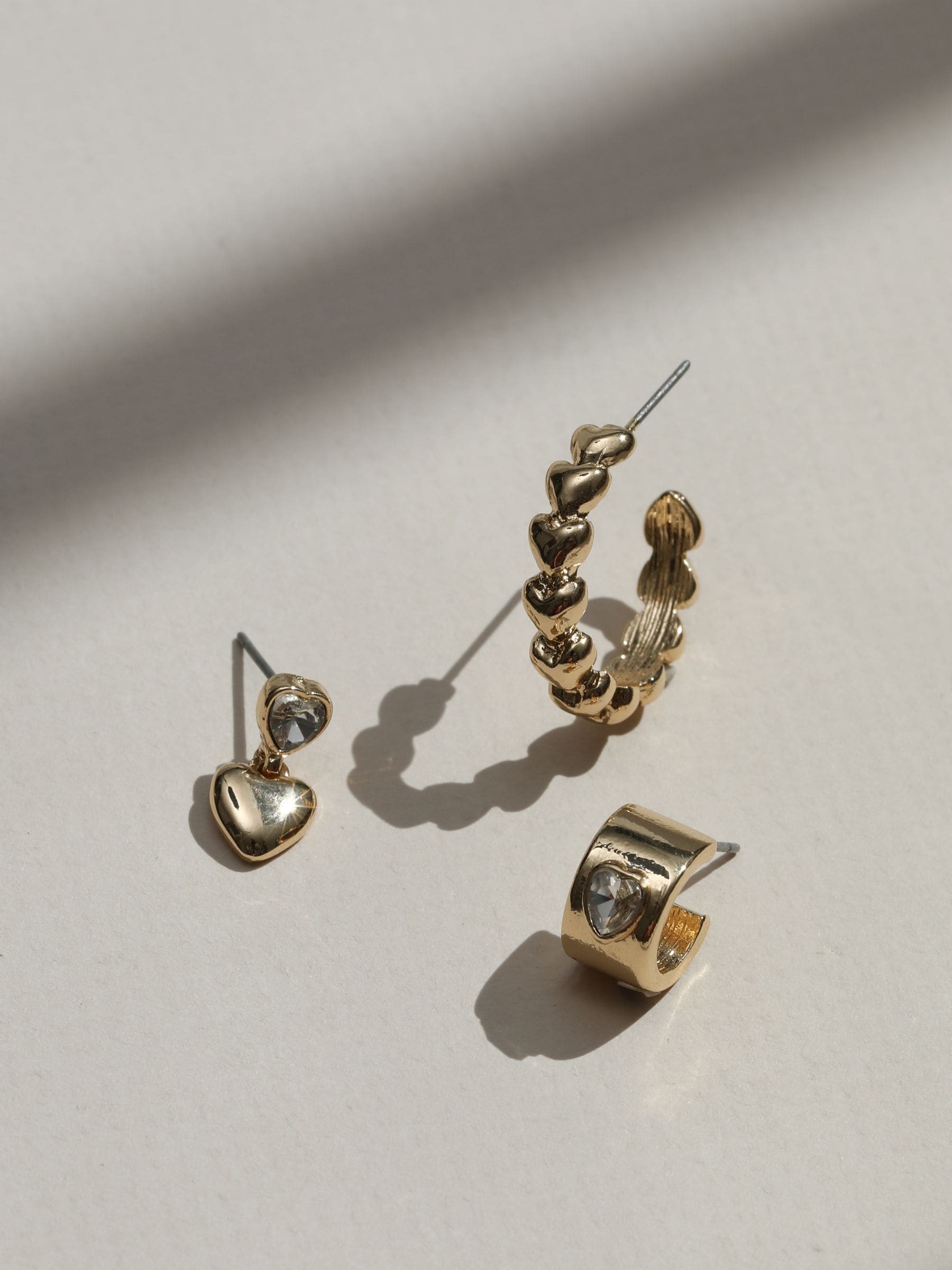 Our Mood Gold Polished & Crystal Heart Earrings are the perfect trio of romance and style. Featuring a polished design, each pair is accented with a sparkling crystal finish for a touch of everyday glam. Wear them solo or mix and match. Fastening: Post and Bullet Back. Width dimension: 8mm, 7mm, 5mm. Length dimension: 15mm, 15mm, 13mm. Material: Gold Plated Base Metal.