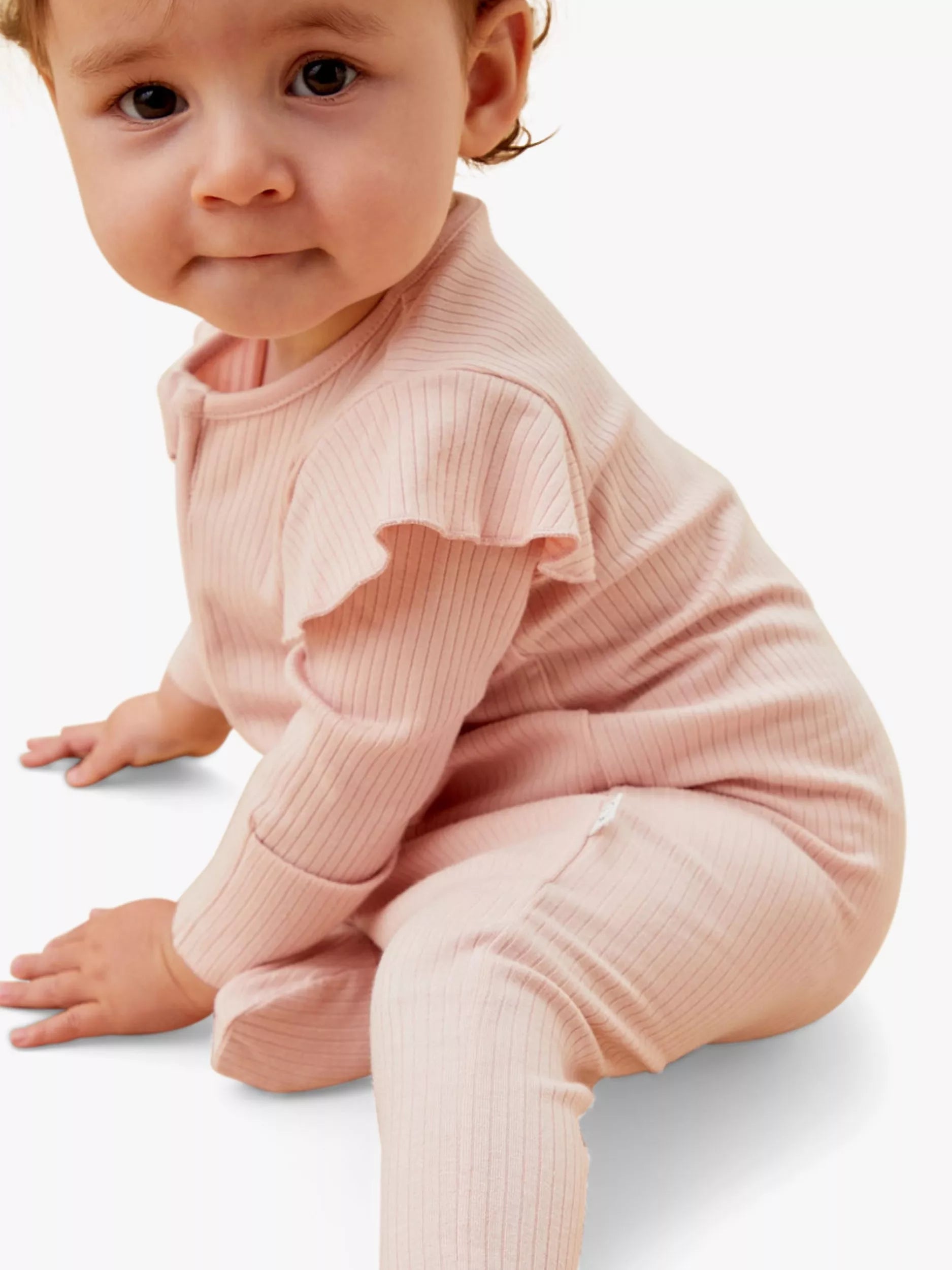 Crafted in a signature fabric that's soft and breathable, this sleepsuit features a two-way zip, with safety tab and pretty frills on the shoulders. For ages up to 9 months, enclosed feet and fold over scratch mitts are included.