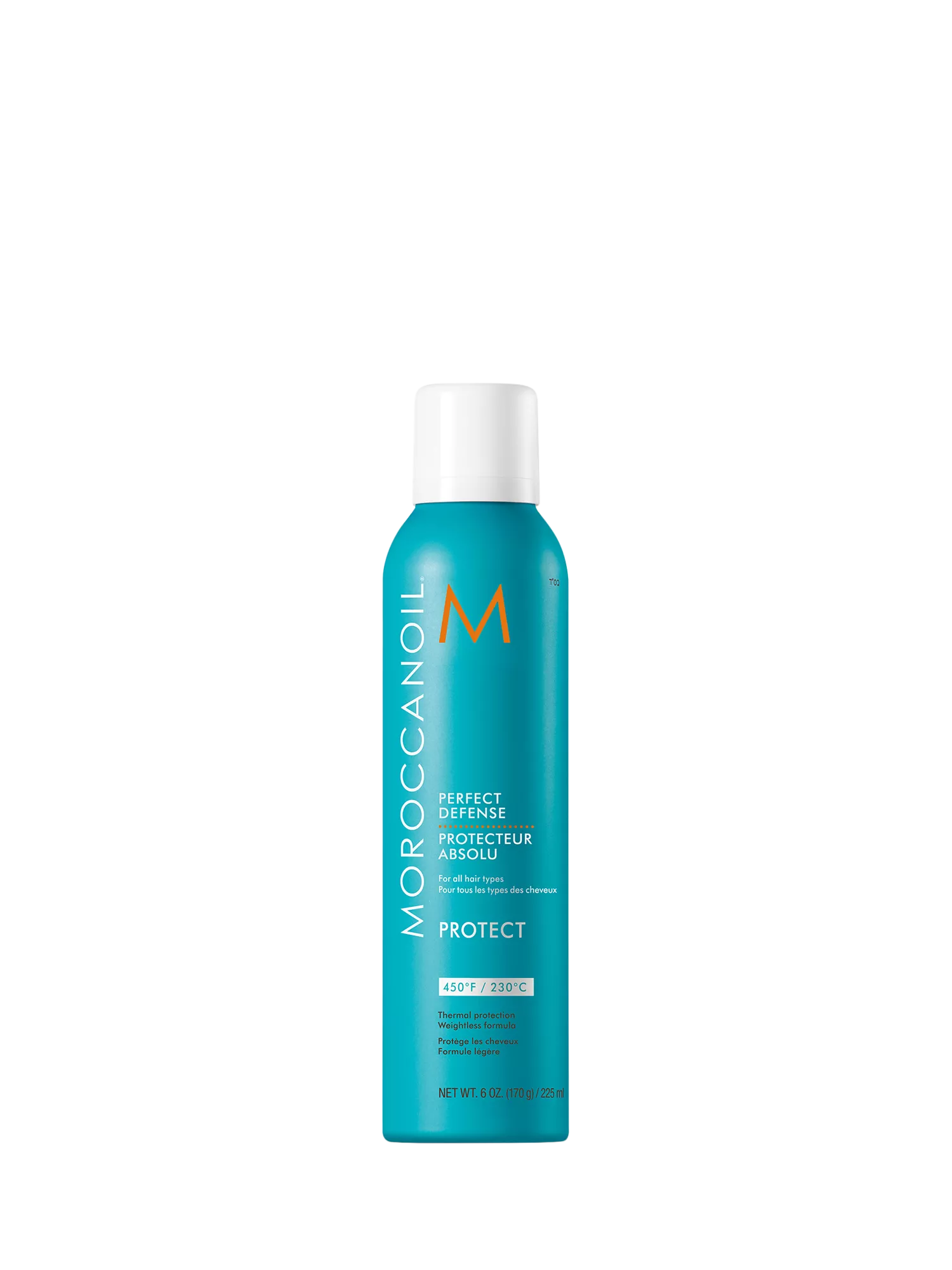 Moroccanoil Perfect Defense is a weightless, dry aerosol, heat protective spray.