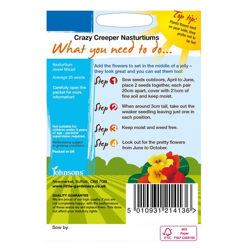 Mr Fothergills Crazy Creeper Nasturtiums provide an interesting addition to your garden space. This variety offers vibrant blooms, and notably, both the flowers and the leaves are safe for consumption. These plants thrive in less fertile conditions, meaning they benefit from poor soil.