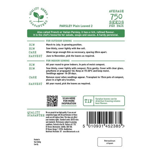 These Mr Fothergills seeds provide plain leaved parsley, also known as French or Italian parsley, prized for its rich, refined flavour. With 750 seeds included, you can cultivate this herb easily in containers or indoors throughout the year.