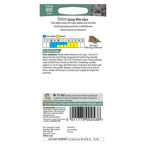Grow your own fresh spring onions with Mr Fothergills White Lisbon seeds. These seeds produce an easily grown crop featuring mild, tasty white bulbs complemented by dark green stems. They are an excellent choice for small spaces, suitable for growing in containers or pots on a balcony.
