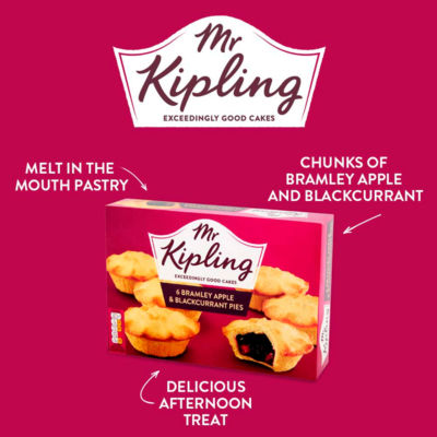 Product InformationEnjoy an indulgent afternoon treat with Mr Kipling's Bramley Apple & Blackcurrant Pies, made with deliciously crumbly shortcrust pastry. Our temptingly tasty pies are full of chunks of sweet Bramley apple and juicy blackcurrants, encased in rich shortcrust pastry. Made using real fruit, our apple & blackcurrant pies contain 100% natural flavours and no artificial colours or hydrogenated fat. Add these Bramley apple pies to packed lunches or picnics, or warm them up and serve with ice cream or custard as a dessert for the whole family. Whether you're taking a moment for yourself or spending time with loved ones, It's the little things that mean the most, like an exceedingly good cake from Mr Kipling.