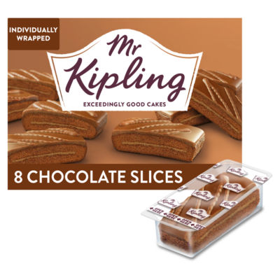 FeaturesMr Kipling Chocolate Slices. Chocolate sandwich cake with chocolate-flavour filling. Lovingly Baked in Britian. Suitable for vegetarians. Sharing-ready pack of eight.
