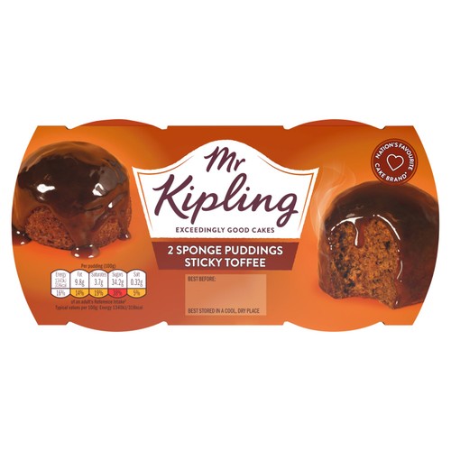 Read MoreThese heavenly Mr Kipling sticky toffee puddings are the perfect desserts. Each pack contains two fluffy sponge puddings, smothered in a delicious sticky toffee sauce. To heat each pudding individually, remove the seal and place your tasty sticky toffee pudding upside down on a small microwavable plate. Heat on full power for 30 seconds – keeping an eye on your pud at all times – then gently remove from the container to allow the velvety sauce to completely coat the sponge. Be careful, as the pot and its contents will be very hot! Count down one minute before enjoying your yummy, warming pudding...Mmm. Why not have as a dessert after your main meal - delicious with custard or on it's own - grab a spoon and dig in!