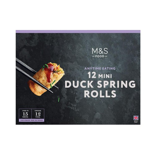 M&S FOOD Mini Duck Spring Rolls provide a convenient and tasty appetizer suitable for any casual gathering. Each pack contains 12 pastry rolls filled with tender duck and vegetables, accompanied by a pot of classic hoisin dipping sauce. These are designed for easy preparation when entertaining guests.