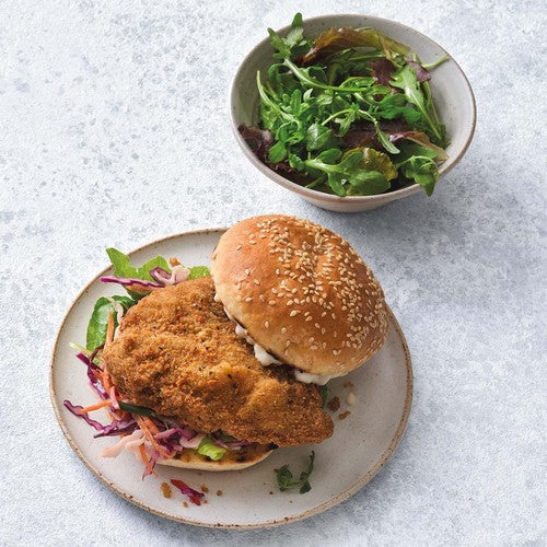 Juicy 100% chicken breast burgers with a golden, peppery and moreish crumb. Oven cooks from frozen in 25 to 30 minutes. Serves 2.