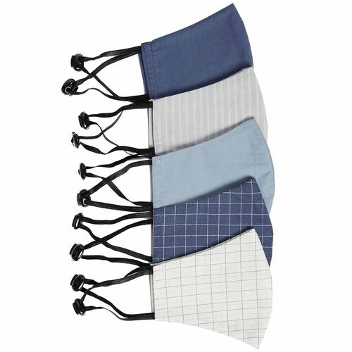 This multipack contains five adult face coverings in assorted colours, including striped and checked patterns. Designed for comfort, they feature elasticised straps and adjustable toggles to ensure a snug fit across the nose and chin. The construction uses a 2-ply cotton material noted for its durability and breathability properties.