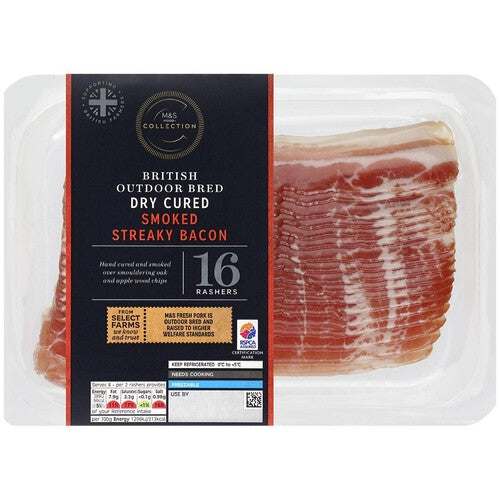 Discover the M&S Collection 16 Dry Cured Smoked Streaky Bacon Rashers offering superior quality. This product features pork sourced from pigs raised outdoors, adhering to high welfare standards. The careful hand-curing process is followed by slow smoking using real oak and applewood chips to develop a deep, classic flavour profile.