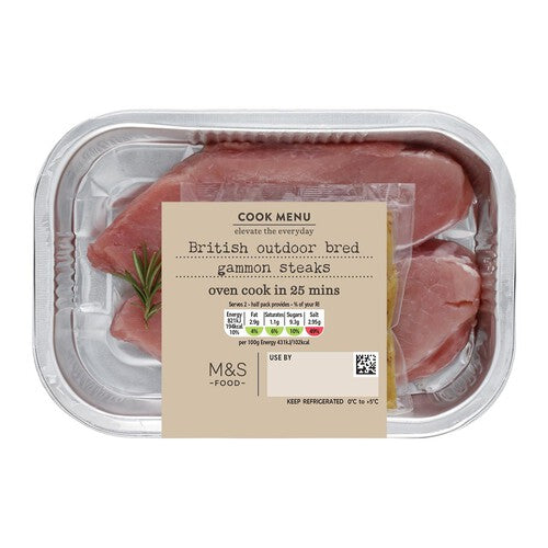 These MS Cook Menu 2 Gammon Steaks are prepared with a rich honey and mustard glaze, providing a delightful flavour profile for your main course. Sourced from British Outdoor Bred pigs, these steaks are designed for easy preparation alongside a traditional dinner setting.