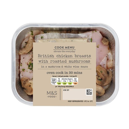 Elevate your evening meal quickly with this M&S ready-to-cook dish featuring British chicken breasts. This convenient option combines tender chicken with roasted mushrooms prepared in a delicate white wine sauce.