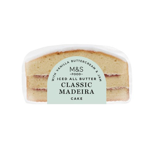 Iced all butter classic madeira cake filled with vanilla buttercream and raspberry jam.