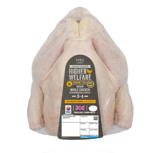 This M&S Oakham Gold Medium Whole Chicken is a fresh, Class A poultry product sourced from select farms. It represents a higher welfare standard, ensuring quality from farm to table. This chicken is naturally high in protein, suitable for various family meals.