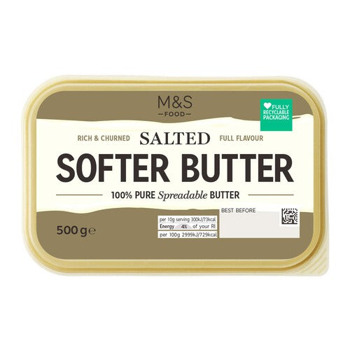 This M&S Salted Softer Butter is carefully churned to achieve optimal creaminess. It is then blended specifically to deliver a smoother texture right from the fridge. This preparation makes it ideal for easily spreading directly onto warm or fresh bread.