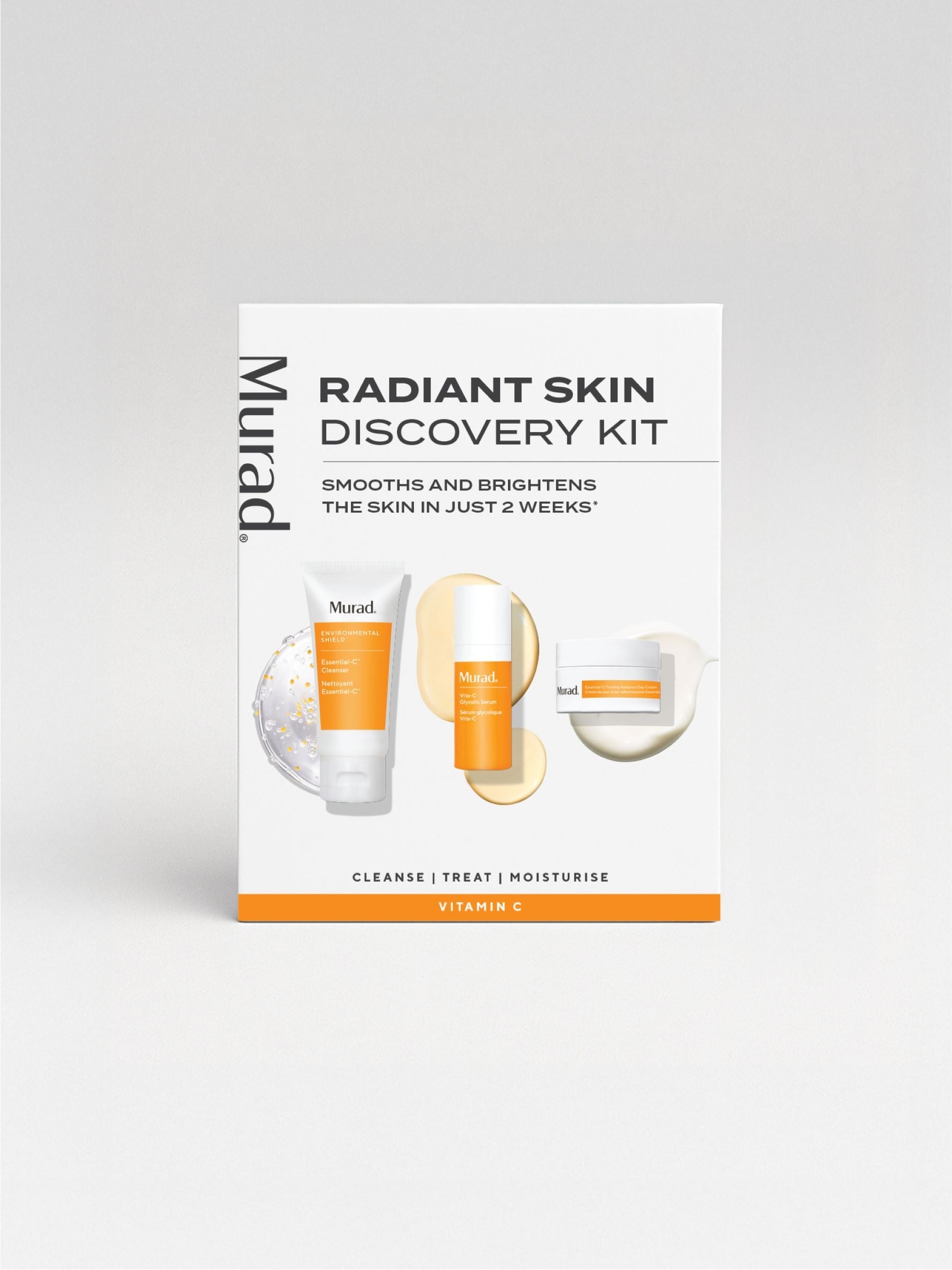 Achieve immediate glow with Murad’s Radiant Skin Discovery Kit. It includes iconic vitamin C essentials needed for a core antioxidant routine that boosts radiance, brightens the skin and minimises the appearance of dark spots in just 2 weeks. ESSENTIAL-C CLEANSER: An energising gel cleanser with a gentle foam that removes pollution and impurities while encouraging brighter skin. RESULT: Brighter, smoother and a more even skin tone. VITA-C GLYCOLIC BRIGHTENING SERUM: A high-tech daily serum, with Vitamin C supporting brighter looking skin and preventing hyperpigmentation, dullness and uneven tone. RESULT: Brightens and smooths the skin in just 2 weeks. ESSENTIAL-C FIRMING RADIANCE DAY CREAM: A lightweight daily moisturiser with Vitamin-C and ceramides, boosting radiance and hydrating for plumper, radiant skin. RESULT: Brightens the skin in just 4 weeks and immediately hydrates.