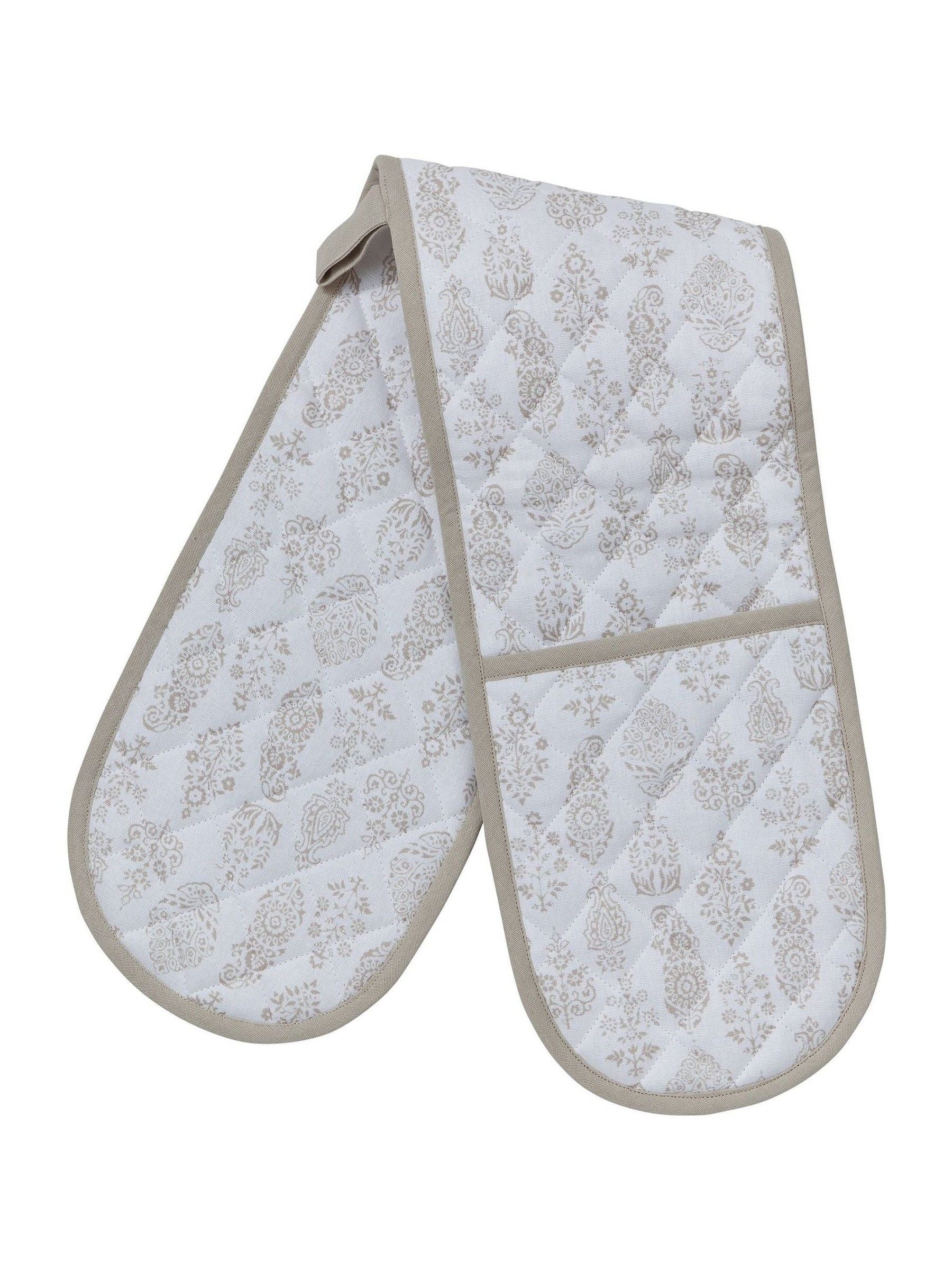 All over paisley patterned double oven glove with piped edging and hanging loop. 100% Cotton.