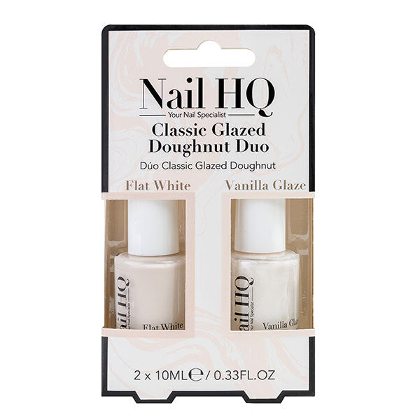 flat white vanilla glaze creating a delightful duo that exudes a sense of understated elegance and sweet simplicity this nail polish oozes creamy soft tones with a subtle hint of warmth and neutrality it offers a versatile and sophisticated look complementing a wide range of styles and occasions from casual to formal formulas are designed to be highly pigmented offering a silkysmooth application and delivering a deep glossy high shine finish creating the perfect glazed nail peta approved crueltyfree vegan friendly how to use to achieve a manicure that looks good enough to eat follow these simple steps using the nail hq classic glazed doughnut duo prepare your nails start by ensuring your nails are clean and dry remove any old polish and shape your nails to your desired length and style apply a base coat begin with a thin layer of your favourite nail base coat this not only helps to protect your natural nails but also provides a smooth canvas for the nail colours to adhere to first layer begin by applying a single coat of flat white the rich pigmented formula ensures even coverage and its silkysmooth texture creates an easy application allow it to dry completely before moving on to the next step second layer after the first coat has dried apply one coat of the tempting vanilla glaze shade to each nail this layer will add a delectable depth of colour and shine finally seal in the gorgeous glazed effect and extend the wear time of your manicure finish with a highquality top coat this will not only enhance the shine but also help protect your nails from chipping and peeling easy to use highly pigmented silkysmooth application highshine finish