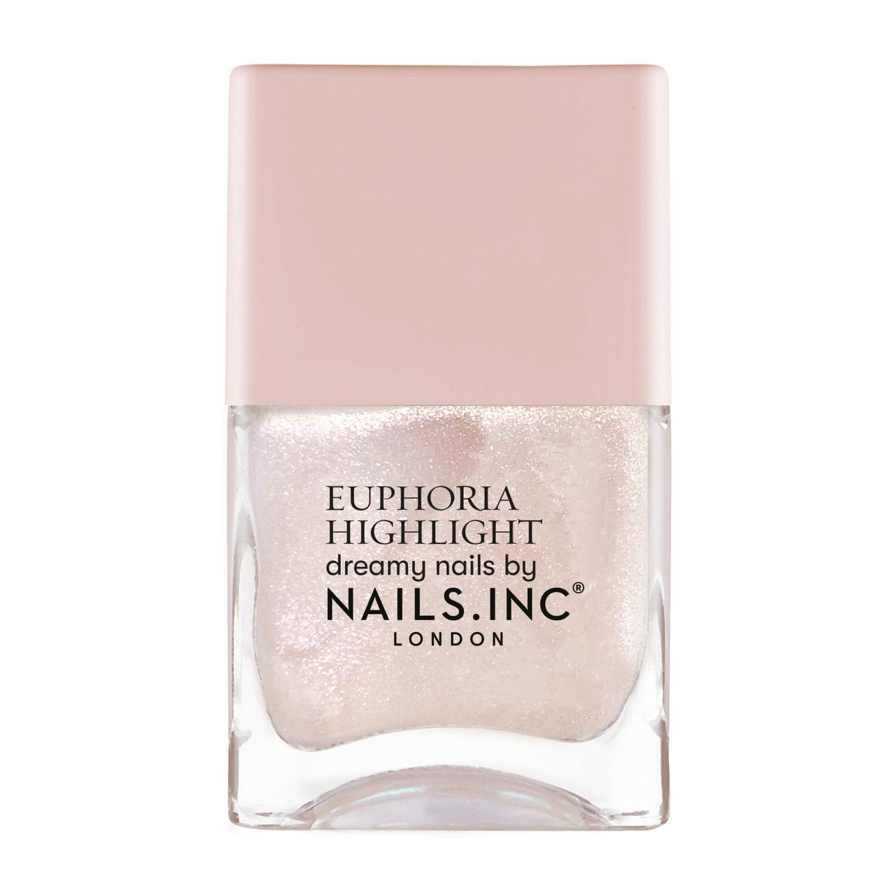 This NAILS.INC offering, named Euphoria Highlight, is formulated to deliver a dreamy, luminous effect for your nails. The polish creates an enchanting, pearlescent finish that catches the light beautifully with soft, iridescent tones visible within the bottle. It is designed to provide a high-impact, shimmering look suitable for use alone or as a dimensional topcoat.