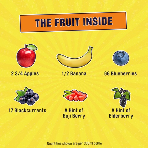 Apple Juice From Concentrate (71%), Apple Puree (12%), Banana Puree, Blueberry Puree (7%), Blackcurrant Puree (1.6%), Elderberry Juice, Goji Berry Extract (0.1%), Natural Flavourings, Vitamins C, E, B6, Thiamine, Riboflavin
